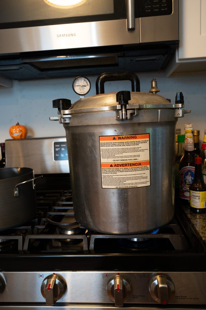 Here, I prepared the jars outside and cleaned them down before bringing them into the house. While the autoclave was warming up, I had the vent valve shut to bring the water to a boil faster. Once the pressure in the autoclave started building. I opened the vent and allowed for excess pressure to vent out and reduced heat to maintain a slow flow of steam out oft he autoclave.